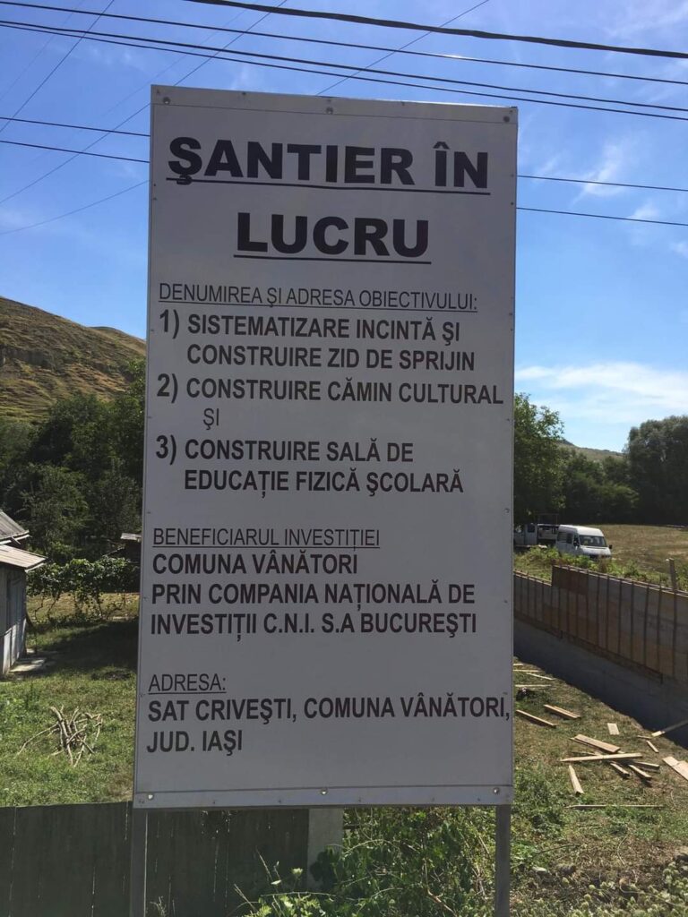 “Având în vedere necesitatea construirii unui Cămin Cultural și a unei săli de sport, în satul Crivești, ținând cont de numărul mare de tineri, din anul 2010 am demarat proceduri de întocmire a proiectelor aferente celor două obiective. În urma a numeroase demersuri am obținut finanțare prin Compania Națională de Investiții “C.N.I.” S.A. București. În prezent, lucrăm la amenajarea și consolidarea terenului, pe care vor fi construite obiectivele”, se arată într-o postare pe pagina de facebook a Primăriei Vânători.
