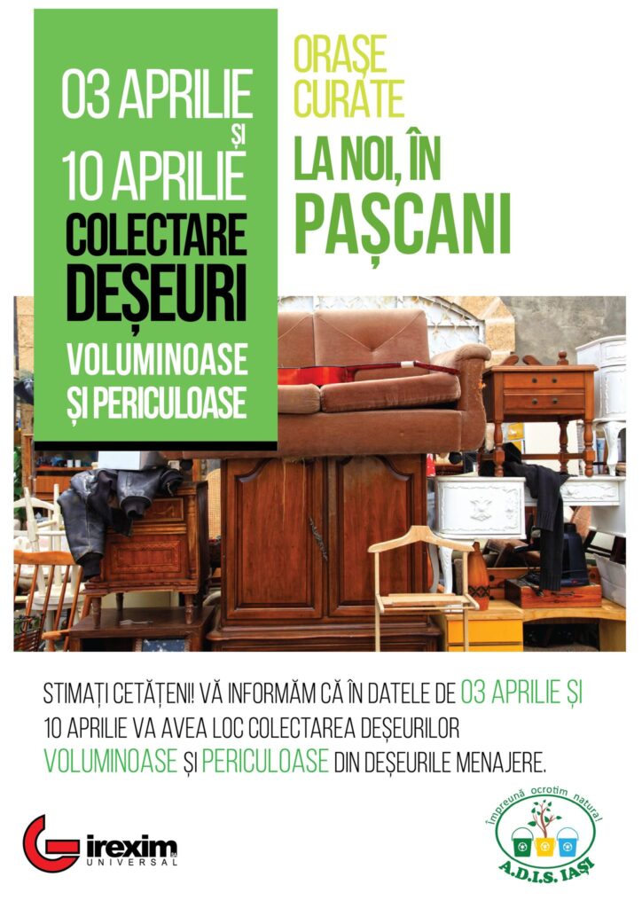 „Informăm locuitorii Municipiului Pașcani că în zilele de 3 și 10 aprilie 2023 se va desfășura o campanie de colectare a deșeurilor voluminoase de pe raza Municipiului Pașcani.