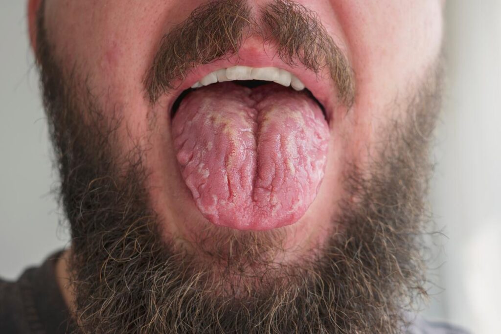 - Depozite albicioase pe limbă, obraji interiori, cerul gurii;