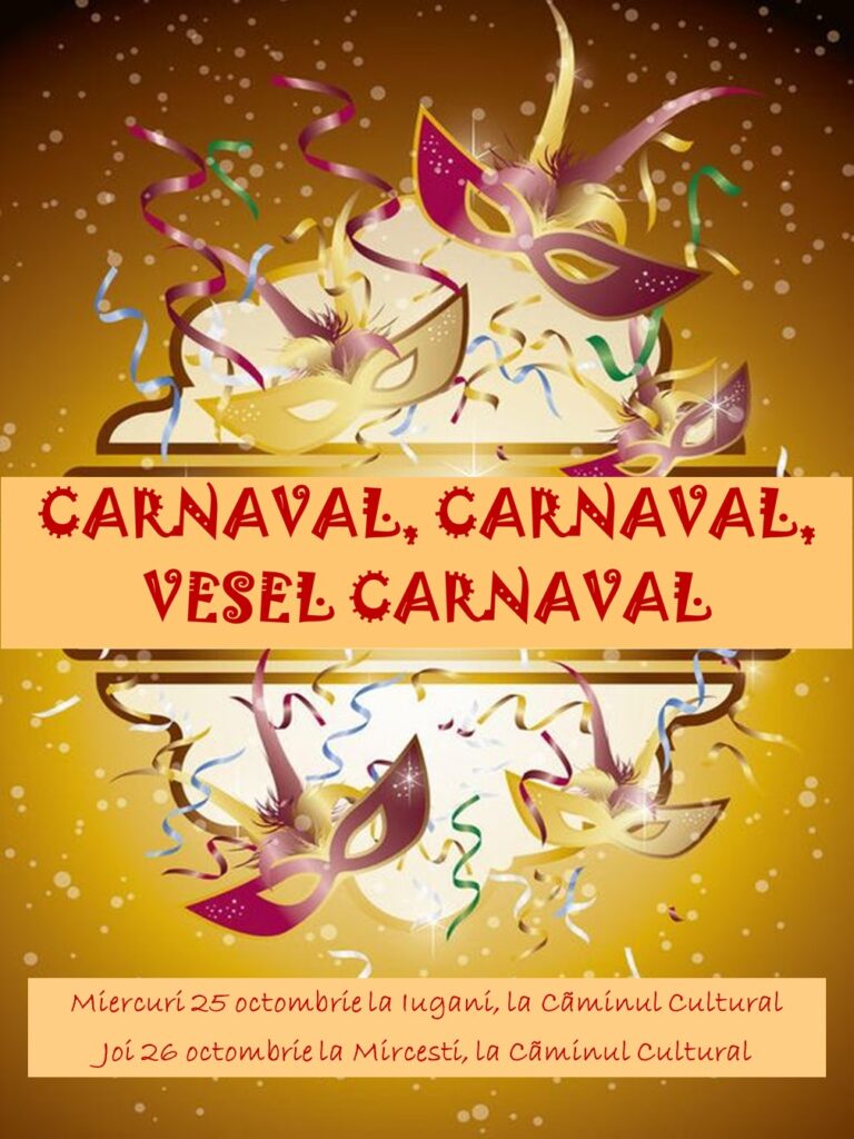 EvenimentCarnaval la Mirceşti și Iugani! de Carmen BălăceanuOctober 11, 2023October 11, 2023078 Share0 Elevii din Mirceşti și Iugani sunt asteptați la Carnaval! – miercuri, 25 octombrie, la Iugani, la Căminul Cultural ; – joi, 26 octombrie, la Mirceşti, la Căminul Cultural. facebook Scoala ,,Vasile Alecsandri” Mircesti