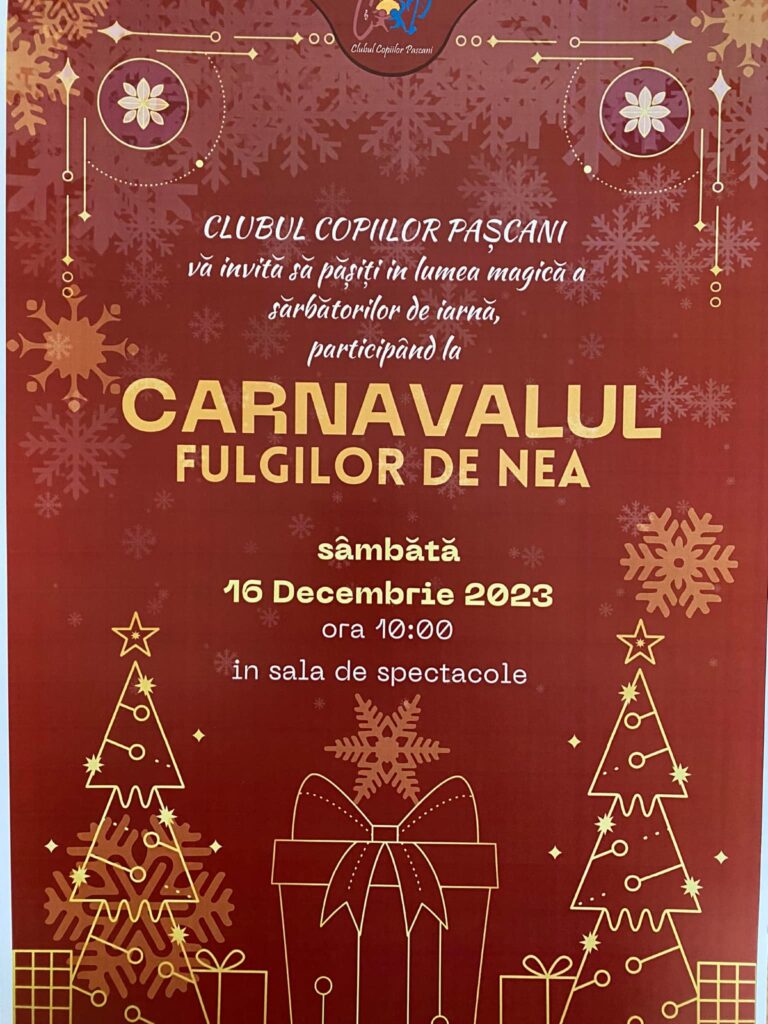 Nicio iarnă fără „Carnavalul fulgilor de nea”! Clubul Copiilor Pașcani organizează sâmbătă, 16 decembrie, o nouă ediție a spectacolului dedicat sărbătorilor de iarnă. Copiii care frecventează cercurile instituției vor susține momente artistice muzicale, de dans, gimnastică și teatru. Evenimentul va avea loc în sala de spectacole a Clubului Copiilor începând cu ora 10:00.