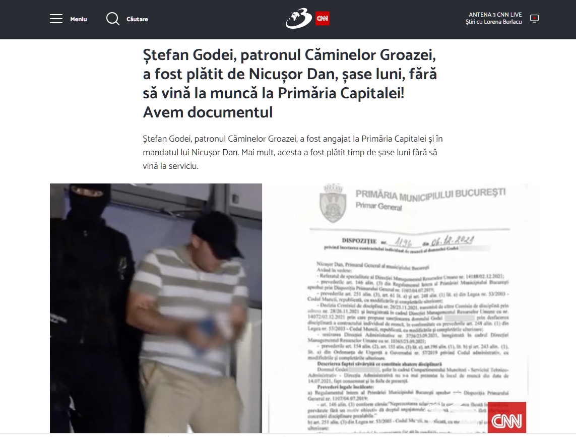 „Ștefan Godei, patronul Căminelor Groazei, a fost angajat la Primăria Capitalei și în mandatul lui Nicușor Dan”, scrie Antena 3.ro, dar care nu menționează nicăieri în tot articolul că Ștefan Godei a fost angajat în timpul mandatului Gabrielei Firea.
