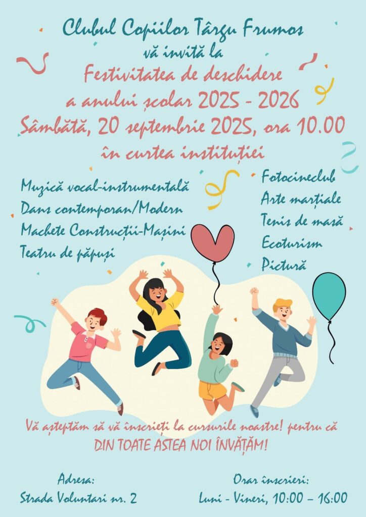 Clubul Copiilor din Târgu Frumos anunță festivitatea de deschidere a anului școlar 2025–2026, care va avea loc sâmbătă, 20 septembrie 2025, începând cu ora 10:00, în curtea instituției.