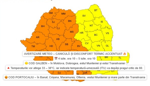 ANM a transmis o avertizare de Cod galben de caniculă pentru zona Moldovei, vineri, 4 iulie, valabil până sâmbătă 5 iulie. Va fi disconfort termic ridicat.