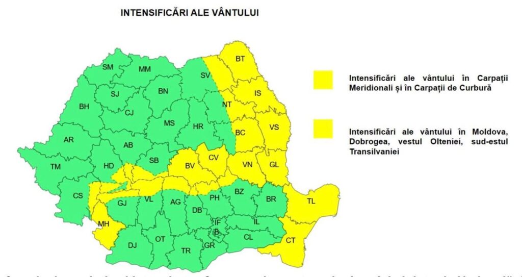 În zonele de câmpie și deal, inclusiv în Moldova, Dobrogea, sud-estul Transilvaniei și vestul Olteniei, sunt așteptate intensificări temporare ale vântului de 50–60 km/h, izolat până la 70 km/h.