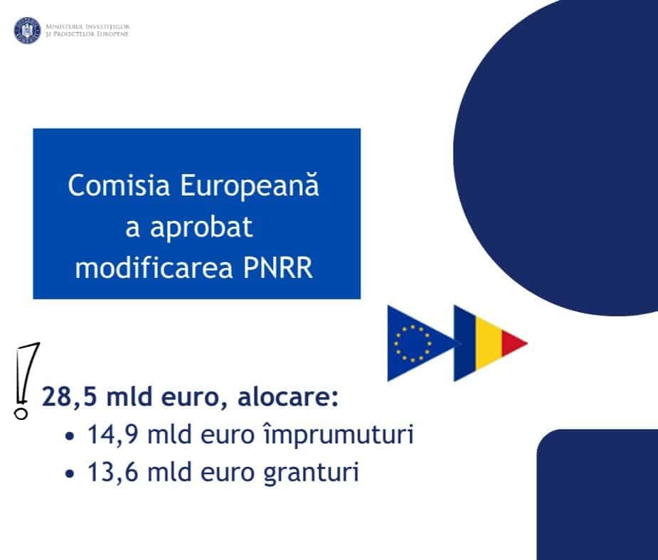 Ieri, Comisia Europeană a aprobat Planul Național de Redresare și Reziliență al României (PNRR), revizuit, plan care include și capitolul REPowerEU pentru infrastructura energetică.Alocarea PNRR este, în prezent, de 28,5 miliarde euro (14,9 miliarde euro sub formă de împrumuturi, 13,6 miliarde euro sub formă de granturi) și acoperă 66 de reforme și 111 investiții.