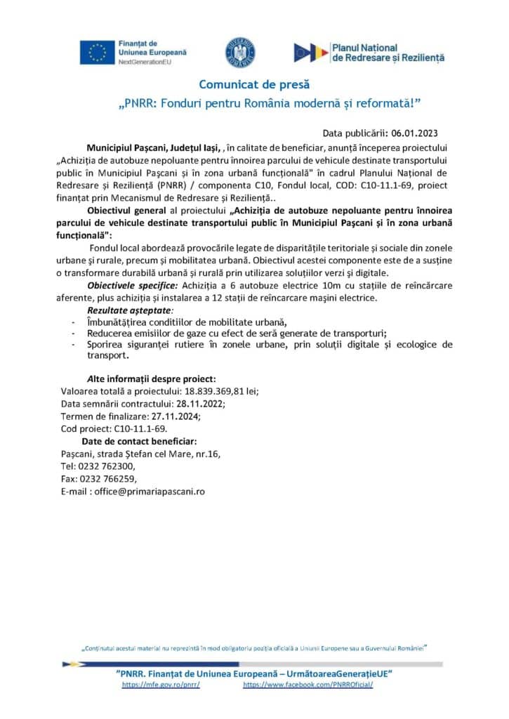 Municipiul Pașcani, Județul Iași, , în calitate de beneficiar, anunță începerea proiectului „Achiziția de autobuze nepoluante pentru înnoirea parcului de vehicule destinate transportului public în Municipiul Paşcani și în zona urbană funcțională” în cadrul Planului Național de Redresare și Reziliență (PNRR) / componenta C10, Fondul local, COD: C10-11.1-69, proiect finanțat prin Mecanismul de Redresare și Reziliență..