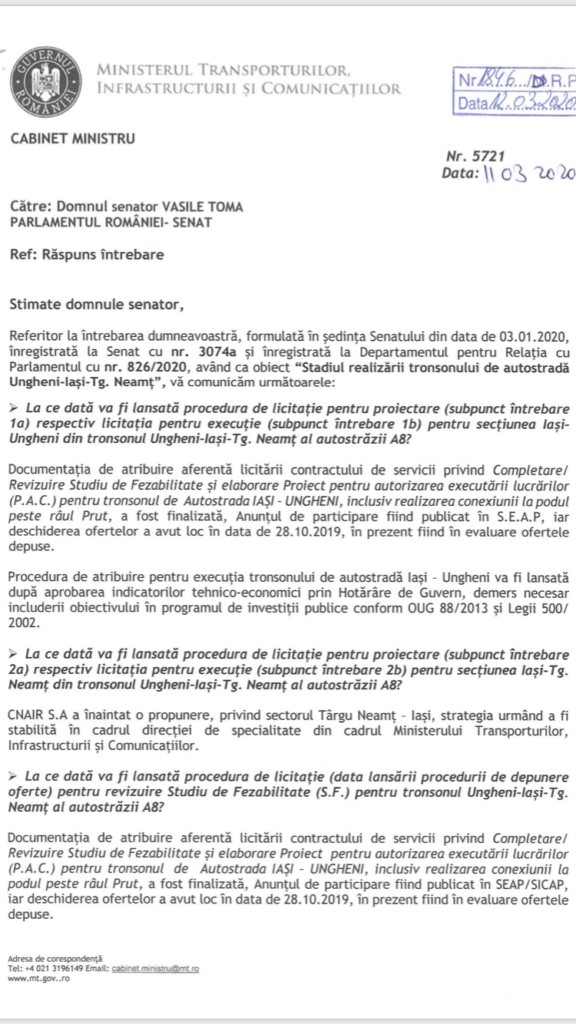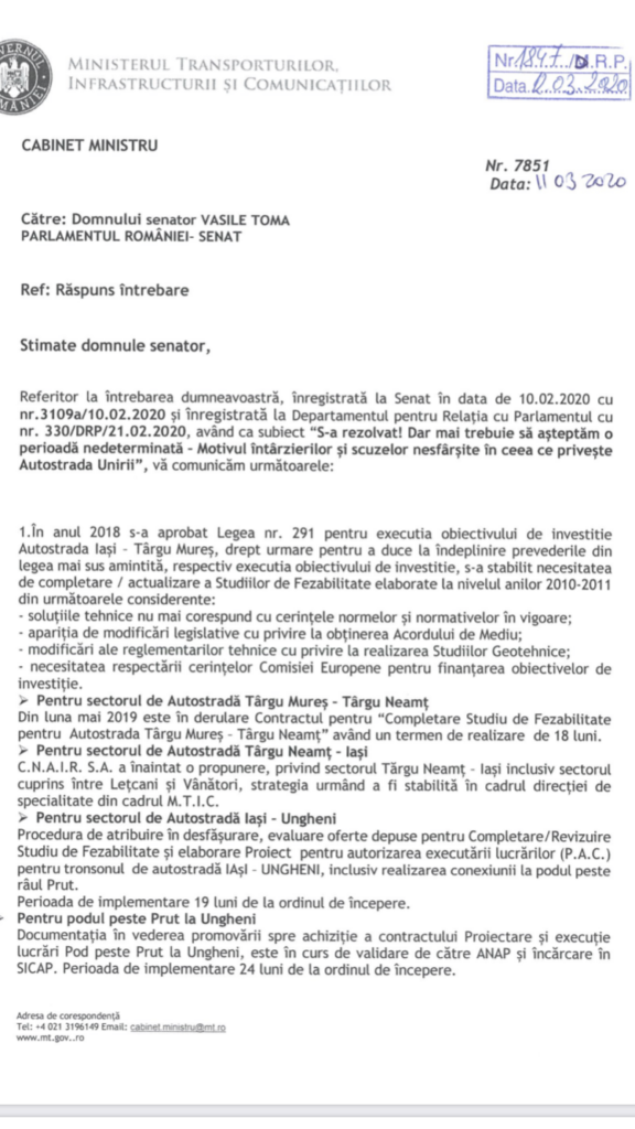 Din păcate, conform ultimelor răspunsuri pe care le-am primit de la Guvernul României (foto mai jos), putem trage concluzia că, după ce au anulat procedura de licitație pentru construcția tronsonului Iași-Pașcani-Tg. Neamț și au tot prelungit termenele pentru toate studiile lansate pe diferite secțiuni, ”se bate pasul pe loc”, într-o așa zisă căutare de soluții de finanțare sau construcție. Probabil că funcționarul etalon al guvernului este un calculator vechi, depășit, care afișează de luni bune mesajul: ”așteptați…”.