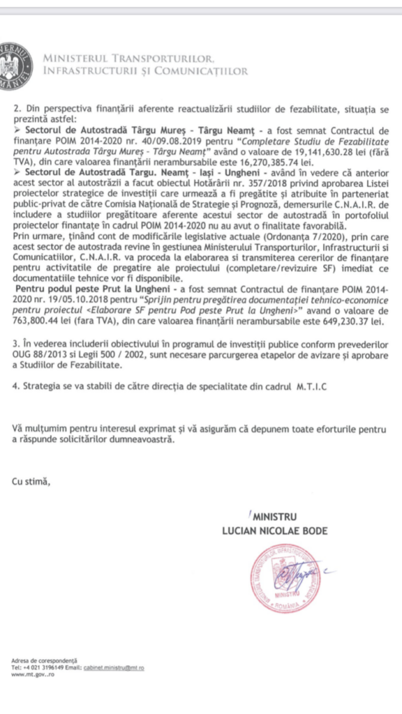 - Actualizarea documentației pentru declararea Autostrăzii Ungheni-Iași-Pașcani-Tg. Neamt-Tg. Mureș ca obiectiv strategic de importanță națională;