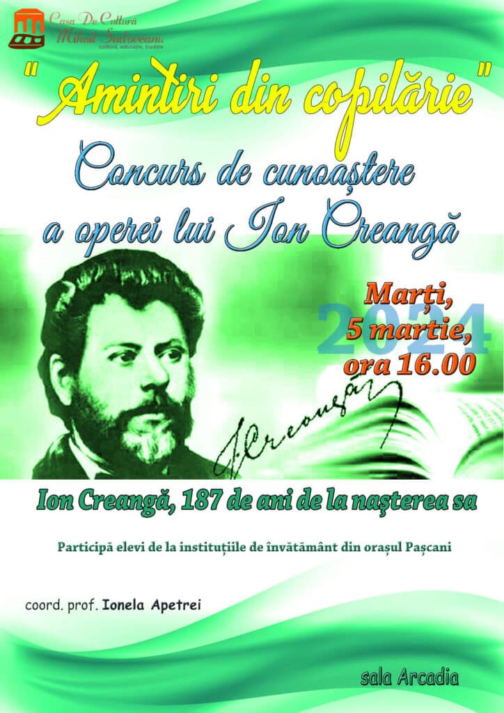 Marți, 5 martie 2024 începând cu ora 16.00 va avea loc Concursul de cunoaștere a operei lui Ion Creangă cu tema : ,,Amintiri din copilărie “. Parteneri: Liceul Tehnologic Economic ,, Nicolae Iorga ” din Pașcani , Liceul Teoretic ,,Miron Costin ” Pașcani, Colegiul Național ,, Mihail Sadoveanu ” din Pașcani , Liceul Tehnologic ,, Mihai Busuioc ” Pașcani, Școala Gimnazială ,, Iordache Cantacuzino ” Pașcani și Școala Gimnazială Gâștești .Concursul se va desfășura în sala Arcadia a Casei de Cultură din Pașcani. Coordonator prof. Ionela Apetrei.