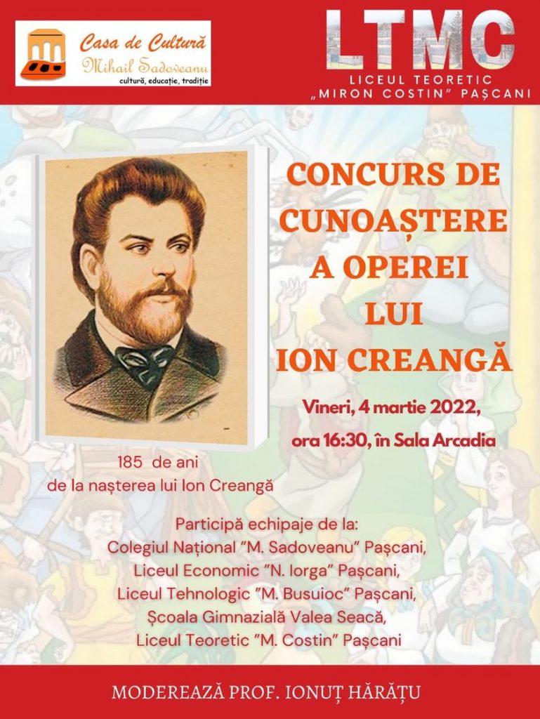 Eveniment cultural cu tradiție la Casa de Cultură din Pașcani. Vineri, 4 martie 2022 începând cu ora 16.30 în sala Arcadia a Casei de Cultură ,,Mihail Sadoveanu” va avea loc cea de-a VI -a ediție a Concursului de cunoaștere a operei lui Ion Creangă.