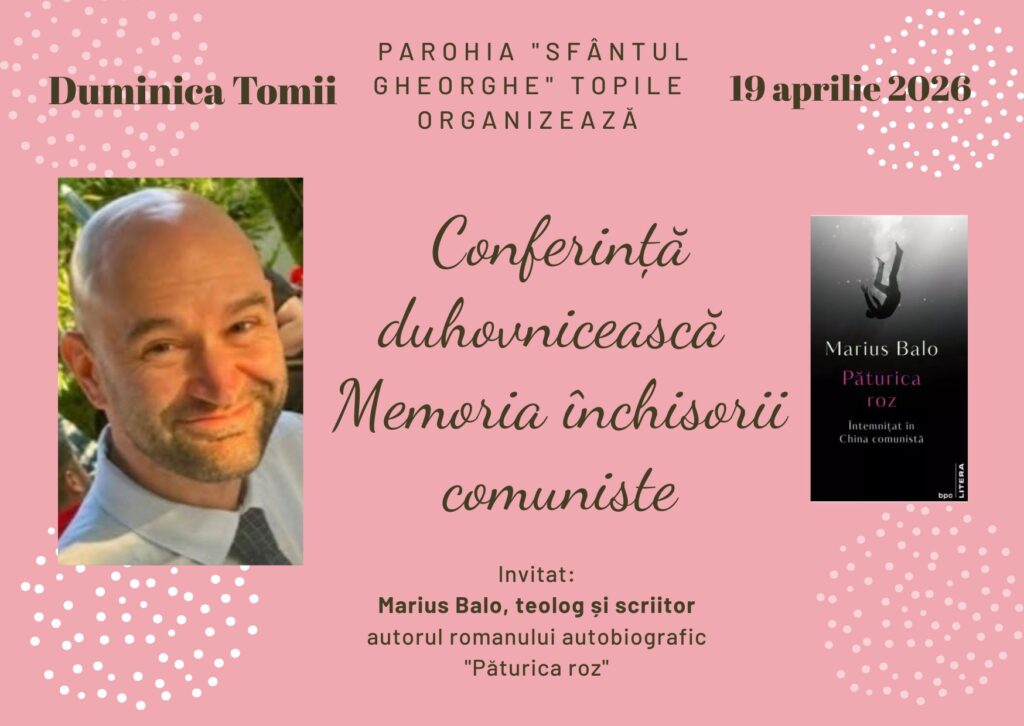 Duminică, 19 aprilie, de la ora 12:00, va avea loc o conferință duhovnicească susținută de Marius Balo, în biserica „Sfântul Gheorghe” din Topile.