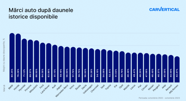 80,3% dintre toate BMW-urile din România care au fost verificate pe carVertical fuseseră avariate în trecut. Honda (79,3%), Hyundai (71,1%), Porsche (69,6%) și Mitsubishi (68,5%) sunt, de asemenea, deteriorate des și prin urmare cumpărătorii ar trebui să fie precauți atunci când cumpără aceste mărci de mașini.