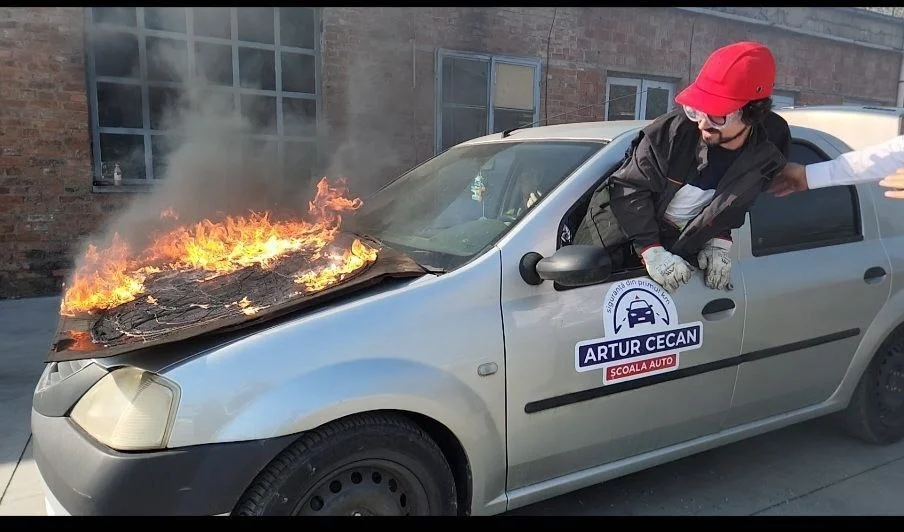 „Elevul nostru ar trebui să fie pregătit să spargă un geam. Și de multe ori nu-l sparge. Flăcările sunt adevărate, doar că e pusă o placă groasă pe capotă să nu aibă contact cu motorul. Noi le zicem că dacă s-a stins flacăra și nu au reușit să iasă prin geam, să ia stingătorul, să stingă focul, au murit. De asta e important să știi unde să lovești în geam, cum și cu ce să lovești, ca să-l poți sparge. Dacă lovești geamul exact în mijloc, se amortizează, ar trebui lovit într-un colț. Apoi, e important să știi cum să tai o centură, cum să ieși dintr-o mașină răsturnată. Pentru că dacă centura este tensionată, ar trebui cumva detensionată, să vă proptiți cumva în tablă și să vă împingeți ca să detensionați centura. Și, dacă tai centura, există riscul să cazi în cap și să-ți fracturezi coloana vertebrală“, detaliază Artur Cecan câteva dintre învățăturile care pot salva vieți.