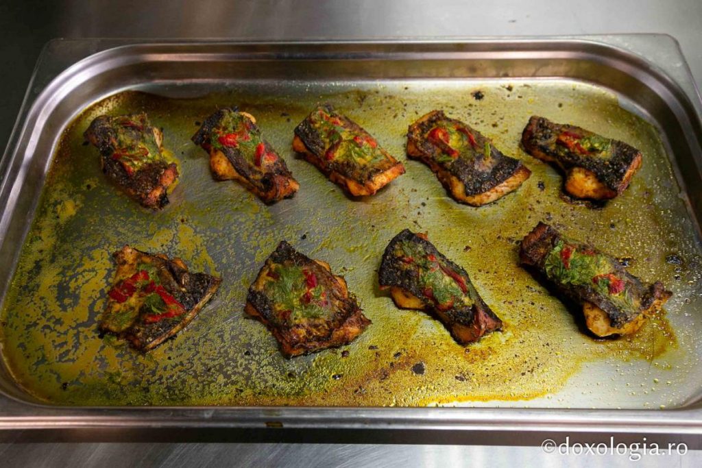 - peștele se așază în tavă, se adaugă zeama obținută în timpul marinării și se dă la cuptor pentru 45 de minute, la 170°C.