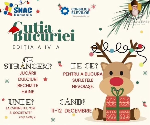 Consiliul Școlar al Elevilor de la Liceul Teoretic “Miron Costin” Pașcani a dat startul unei noi ediții “Cutia Bucuriei”. Între 11 si 12 decembrie, elevii si dascălii liceului vor strânge jucării, dulciuri, rechizite si haine pentru a ajuta copii nevoiași.