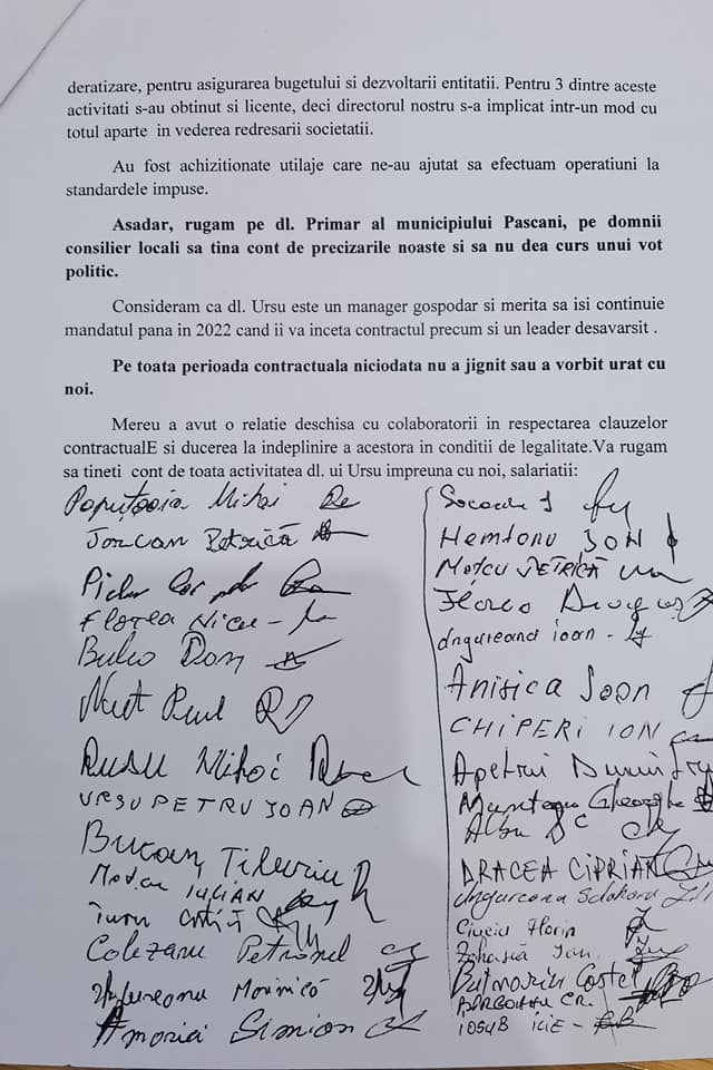 În el se vorbește despre calitățile managerului Leonard Ursu și munca depusă de el de când a fost numit director, dar și o recomandare către aleșii locali:”să nu dea curs unui vot politic!”, se arată în documentul susținut de Andrei Burțilă, angajat al societății.