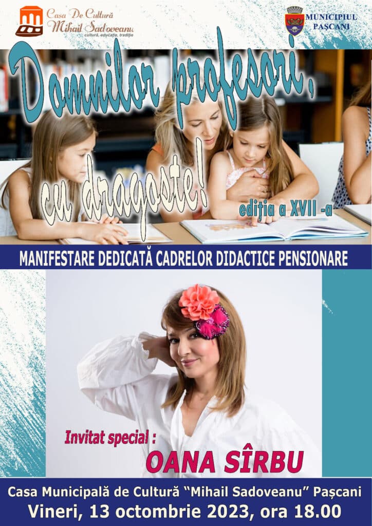 ”Ca în fiecare toamnă, în luna octombrie, sărbătorim dascălii, pe cei care au muncit cu mult drag pentru că aceasta le-a fost menirea: să modeleze suflete și să formeze caractere frumoase, demne pentru viață! Așadar, alături de îndrăgita artistă Oana Sîrbu, vă așteptăm vineri, 13 octombrie, 2023, ora 18.00, la o nouă ediție a manifestării DOMNILOR PROFESORI, CU DRAGOSTE!”, este mesajul organizatorilor.