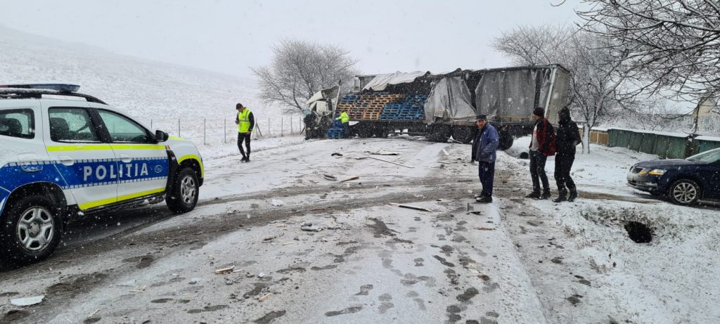 Două vehicule grele, o autoutilitară de transport preparate din carne și două autoturisme au fost implicate într-un accident rutier care a avut loc marți dimineață pe E 85, la Roșiori, în condiții de carosabil acoperit cu zăpadă frământată. La fața locului au intervenit pompierii militari ai Detașamentului Fălticeni, cu modulul SMURD (autospecială pentru descarcerare și o ambulanță SMURD B2) cu sprijinul unui echipaj al Serviciului de Ambulanță Județean.