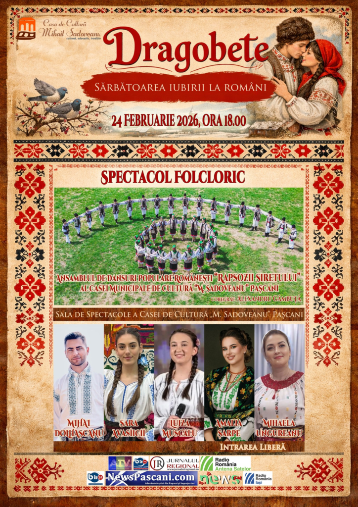 Casa Municipală de Cultură „Mihail Sadoveanu” din Pașcani organizează marți, 24 februarie 2026, de la ora 18:00, un spectacol dedicat sărbătorii de Dragobete. Evenimentul aduce în prim-plan tradițiile românești și celebrarea iubirii în spirit autentic popular.