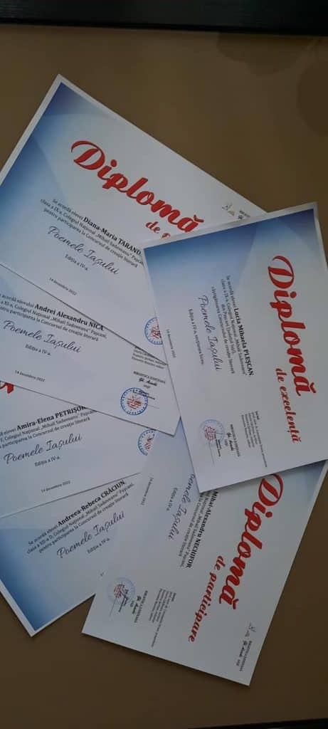 Asemenea ei, alți cinci elevi talentați ai școlii noastre, participanți la același concurs, au impresionat juriul prin frumoase poezii pentru care au fost premiați prin publicarea în antologia „Poemele Iașului, 2022”: