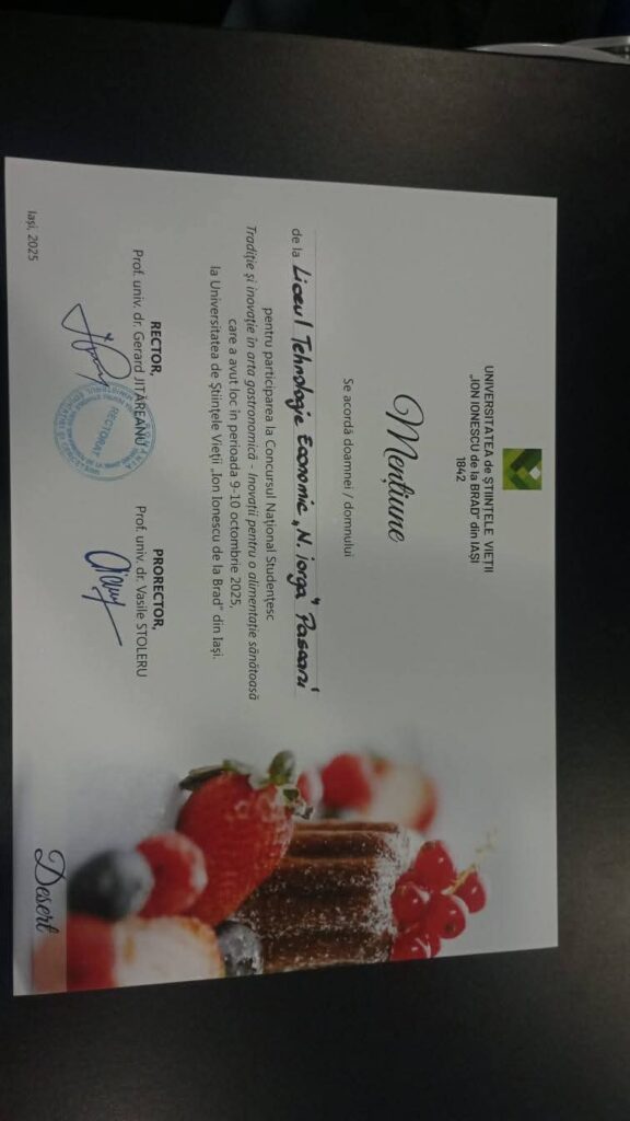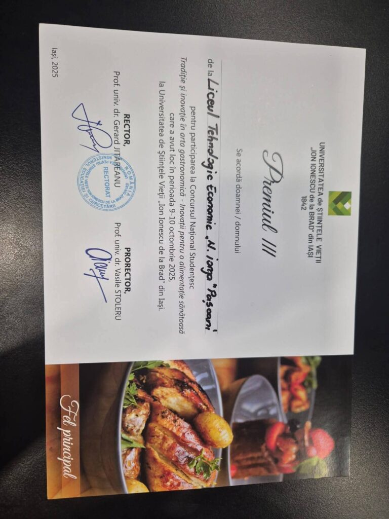 Echipa Liceului Tehnologic Economic „Nicolae Iorga” din Pașcani a obținut rezultate remarcabile la Concursul Național Studențesc „Tradiție și inovație în arta gastronomică”, organizat de Universitatea de Științele Vieții „Ion Ionescu de la Brad” din Iași. Evenimentul a reunit elevi și studenți pasionați de gastronomie din întreaga țară, oferindu-le ocazia de a-și demonstra creativitatea și măiestria culinară.