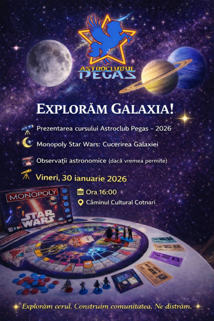 Clubul de astronomie Pegas organizează, vineri, 30 ianuarie 2026, începând cu ora 16:00, un eveniment dedicat pasionaților de astronomie, la Căminul Cultural Cotnari.