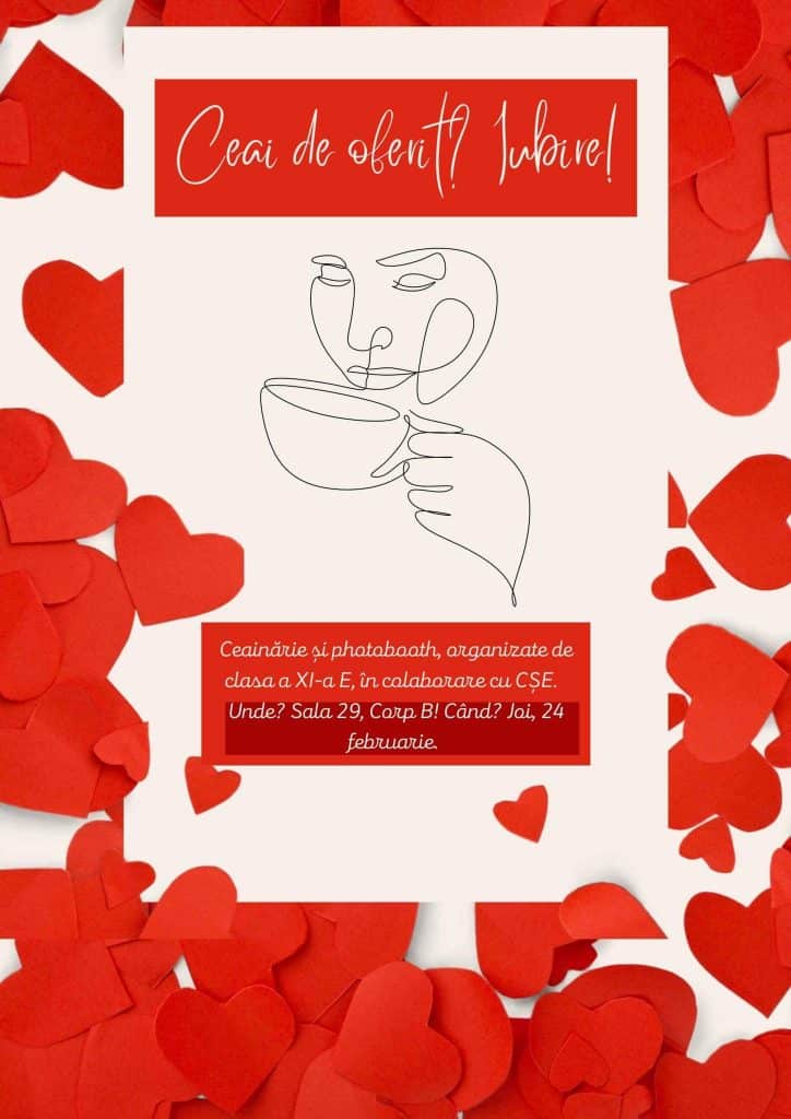 „Ceai de oferit? Iubire!” este o altă activitate ce se va desfășura pe 24 februarie, la Colegiul „Sadoveanu”, organizată de clasa a XI-a E, împreună cu Consiliul Școlar al Elevilor. Ceainărie și o cabină foto vor fi amenajate pentru elevii școlii, în sala 29, corpul B. Acest eveniment este caritabil organizat pentru a venit în ajutorul Biancăi Buduroi, eleva din Gâștești.