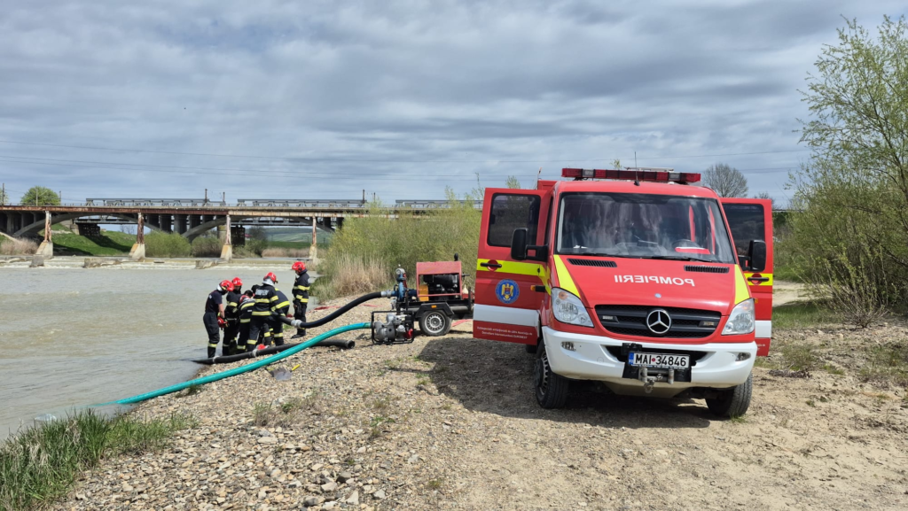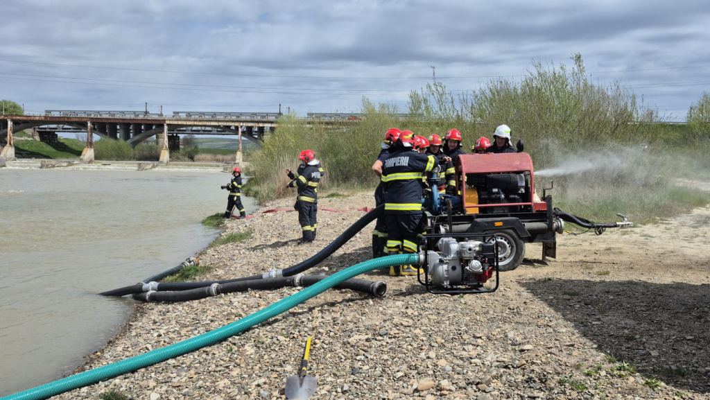 Pompierii militari au desfășurat un exercițiu de intervenție pentru gestionarea situațiilor de urgență generate de inundații pe râul Siret, în zona Blăgești, municipiul Pașcani.