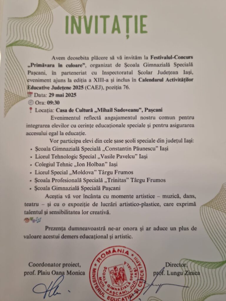 Joi, 29 mai 2025, începând cu ora 09:30, la Casa de Cultură „Mihail Sadoveanu” din Pașcani se va desfășura Festivalul-Concurs „Primăvara în culoare”, ajuns la ediția a XIII-a. Evenimentul este organizat de Școala Gimnazială Specială Pașcani, în parteneriat cu Inspectoratul Școlar Județean Iași, și este inclus în Calendarul Activităților Educative Județene 2025, la poziția 76.