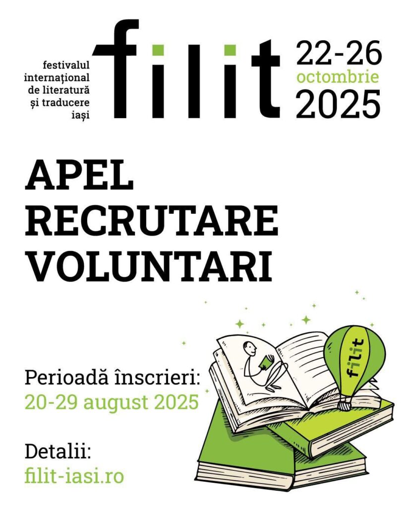 Dacă vrei să contribui la organizarea unuia dintre cele mai apreciate festivaluri literare din Europa, Festivalul Internațional de Literatură și Traducere Iași – FILIT își deschide înscrierile pentru voluntari. Cei interesați se pot înscrie completând formularul disponibil pe site-ul oficial până pe 29 august 2025.