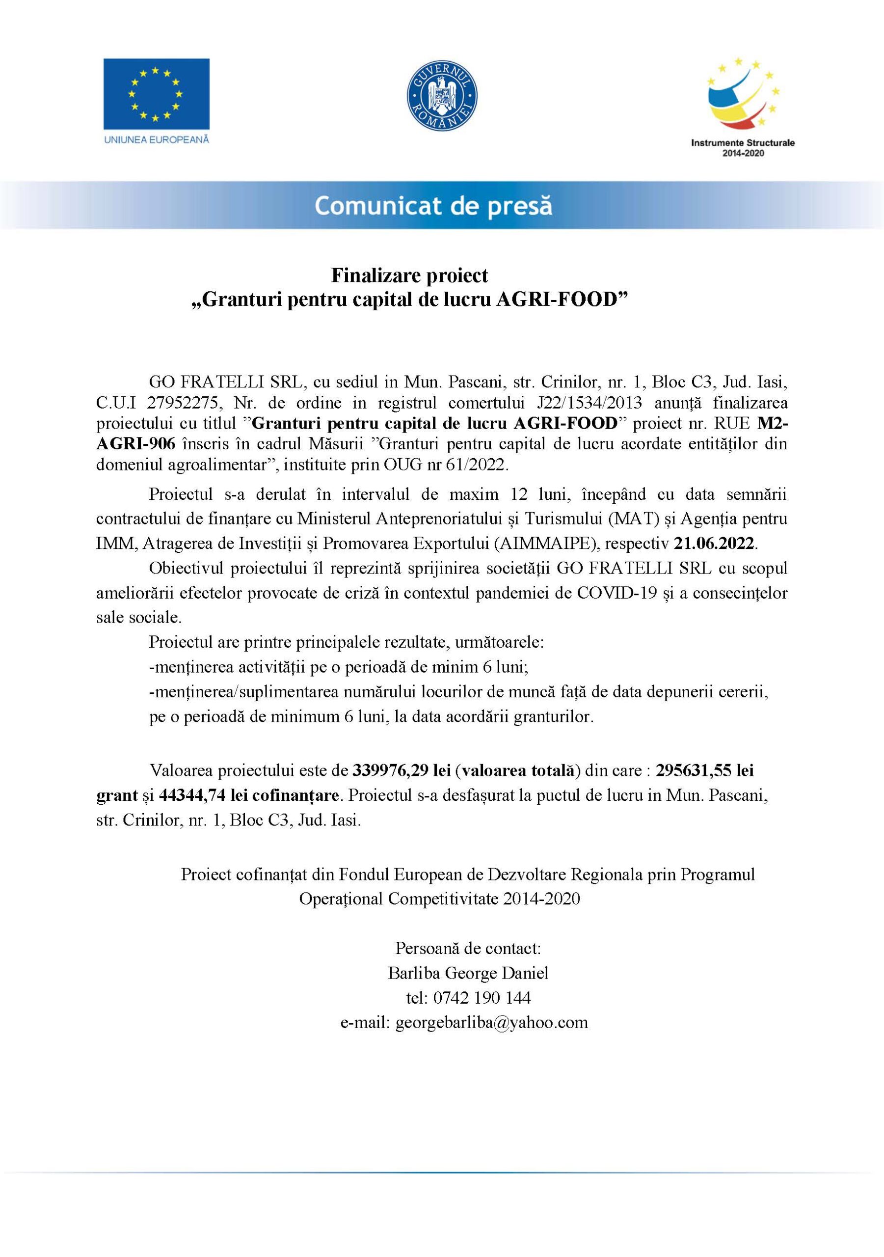 proiectului cu titlul ”Granturi pentru capital de lucru AGRI-FOOD” proiect nr. RUE M2-
