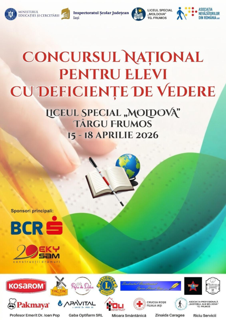 Sub egida Ministerului Educației și Cercetării, Inspectoratul Școlar Județean Iași în parteneriat cu Liceul Special “Moldova” Târgu Frumos și Asociația Nevăzătorilor din România a organizat, în perioada 15-18 aprilie 2026, etapa națională a Concursului Național pentru Elevi cu Deficiențe de Vedere, ediția a 40-a. Acest eveniment de referință pentru învățământul special românesc, a reunit delegații din întreaga țară, oferind un cadru de afirmare pentru talentul și efortul intelectual al elevilor.