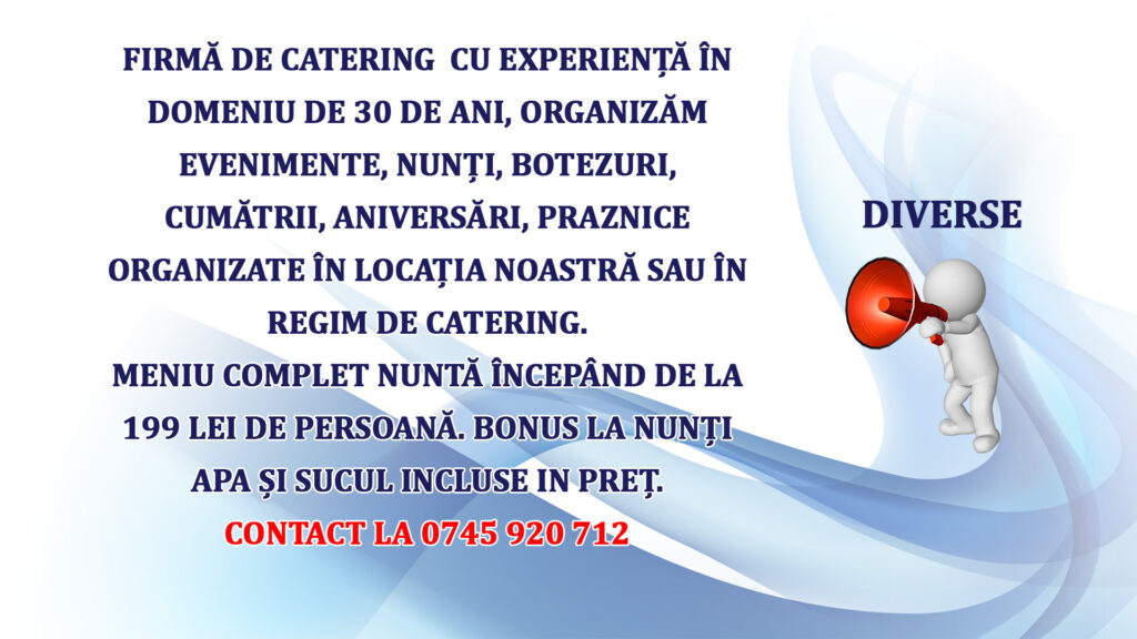 Firmă de catering cu experiență în domeniu de 30 de ani, organizăm evenimente, nunți, botezuri, cumătrii, aniversări, praznice organizate în locația noastră sau în regim de catering.