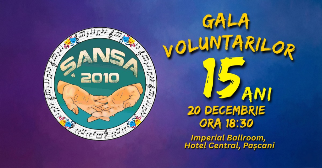Asociația „ȘANSA 2010” sărbătorește 15 ani de activitate neîntreruptă prin organizarea Galei voluntarilor, eveniment care va avea loc sâmbătă, 20 decembrie 2025, de la ora 18:30, la Hotel Central Pașcani, în sala Imperial Ballroom.