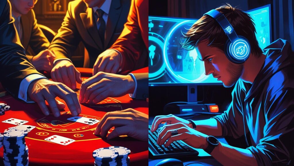 La fel ca în jocurile video, platformele de online poker inițiază turnee și realizează ierarhii, propunând uneori chiar statusuri speciale pentru anumiți jucători și fel de fel de recompense pentru performanță. Turneele live de poker transmise pe Twitch sau YouTube seamănă de altfel cu nișa eSports, un alt domeniu pe placul Generației Z.