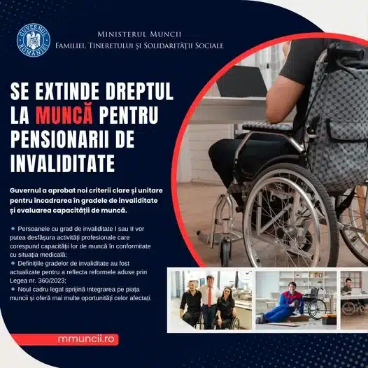 În același timp, criteriile de încadrare în gradele de invaliditate au fost actualizate pentru a reflecta legislația în vigoare și pentru a asigura o evaluare mai corectă a capacității de muncă a fiecărei persoane. Astfel, procesul de evaluare a invalidității devine mai clar și mai uniform, iar pensionarii de invaliditate vor beneficia de un cadru mai predictibil și mai accesibil în ceea ce privește integrarea lor pe piața muncii.