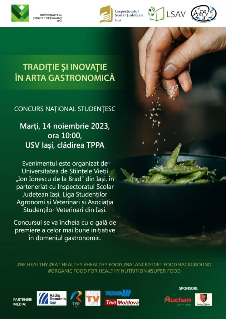 Pasionații de gastronomie, studenți și elevi deopotrivă, își vor demonstra talentul în cadrul Concursului Național Studențesc „TRADIŢIE ŞI INOVAŢIE ÎN ARTA GASTRONOMICĂ” organizat de Universitatea de Științele Vieții „Ion Ionescu de la Brad” din Iași (USV), în parteneriat cu Inspectoratul Școlar Județean Iași, Liga Studenților Agronomi și Veterinari și cu Asociația Studenților Veterinari din Iași.