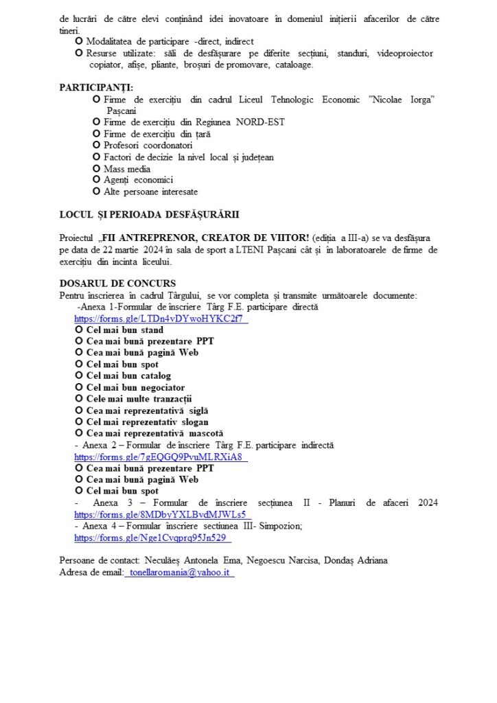 Liceul Tehnologic Economic ”Nicolae Iorga” Pașcani vă informeazã despre organizarea evenimentului ”FII ANTREPRENOR, CREATOR DE VIITOR!” care se va desfăşura pe data de 22 martie 2024.