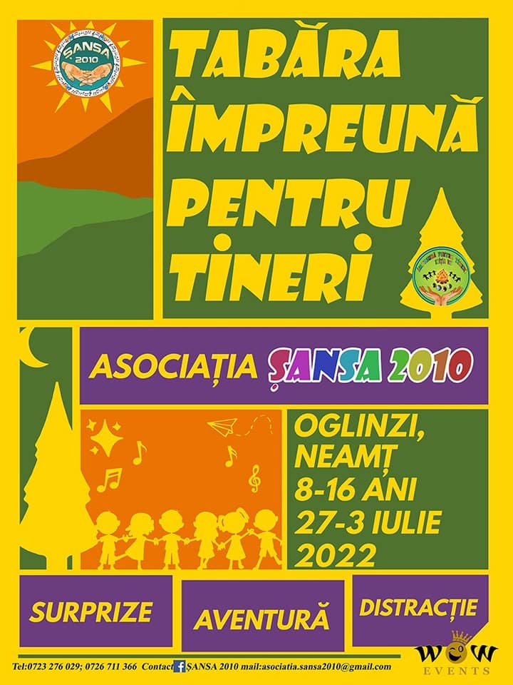 Hai în tabăra „Împreună pentru tineri”! Asociația „Șansa 2010” reușește și în acest an să ofere locuri în tabără copiilor care provin din familii cu o situație materială precară. Potrivit informațiilor oferite de Mihaela Spiridon, reprezentantul Asociației „Șansa 2010”, cu un sprijin venit din partea municipalității vor putea fi acoperite cheltuielile pentru acești copii, din Pașcani și zonele învecinate, cu vârste cuprinse între 8 și 14 ani.