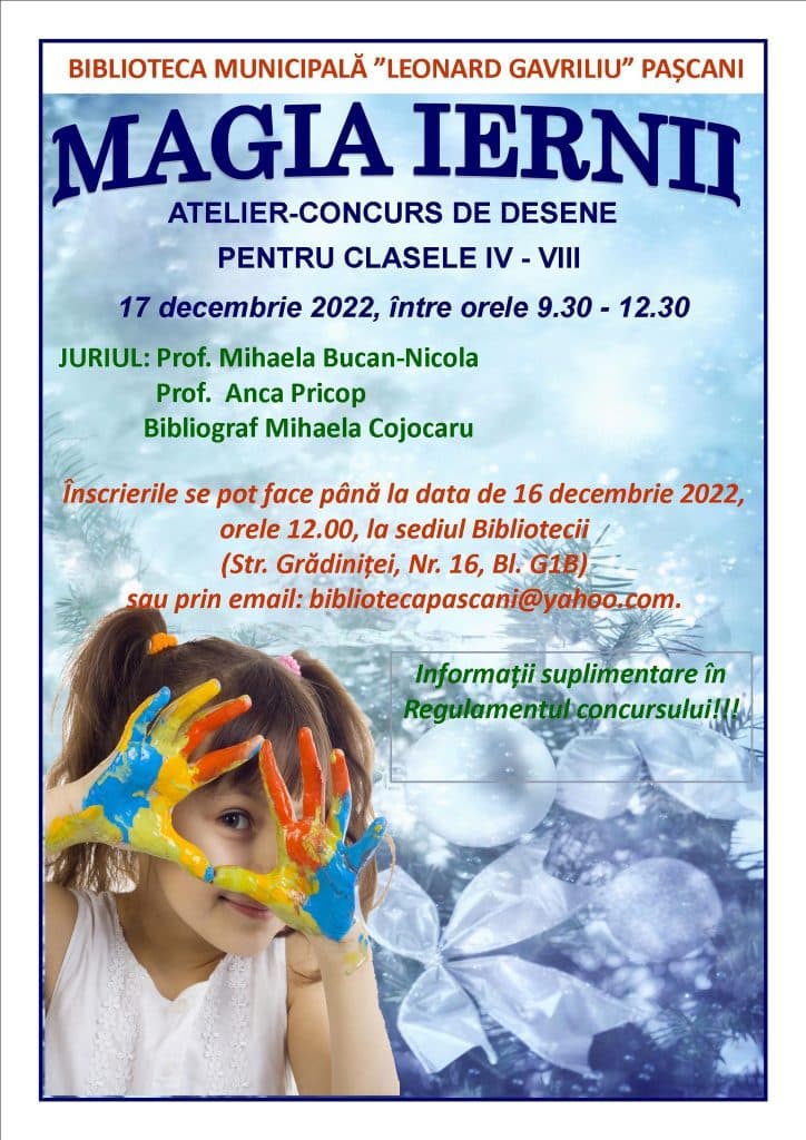 EvenimentMagia iernii la Biblioteca Municipală Pașcani de RedacțiaDecember 13, 2022December 13, 20220183 Share0 Atelier concurs de desene pentru elevi. Evenimentul intitulat Magia iernii va avea loc la Biblioteca Municipală Leonard Gavriliu și se adresează elevilor din clasele IV-VIII. Înscrierile se fac până pe 16 decembrie.