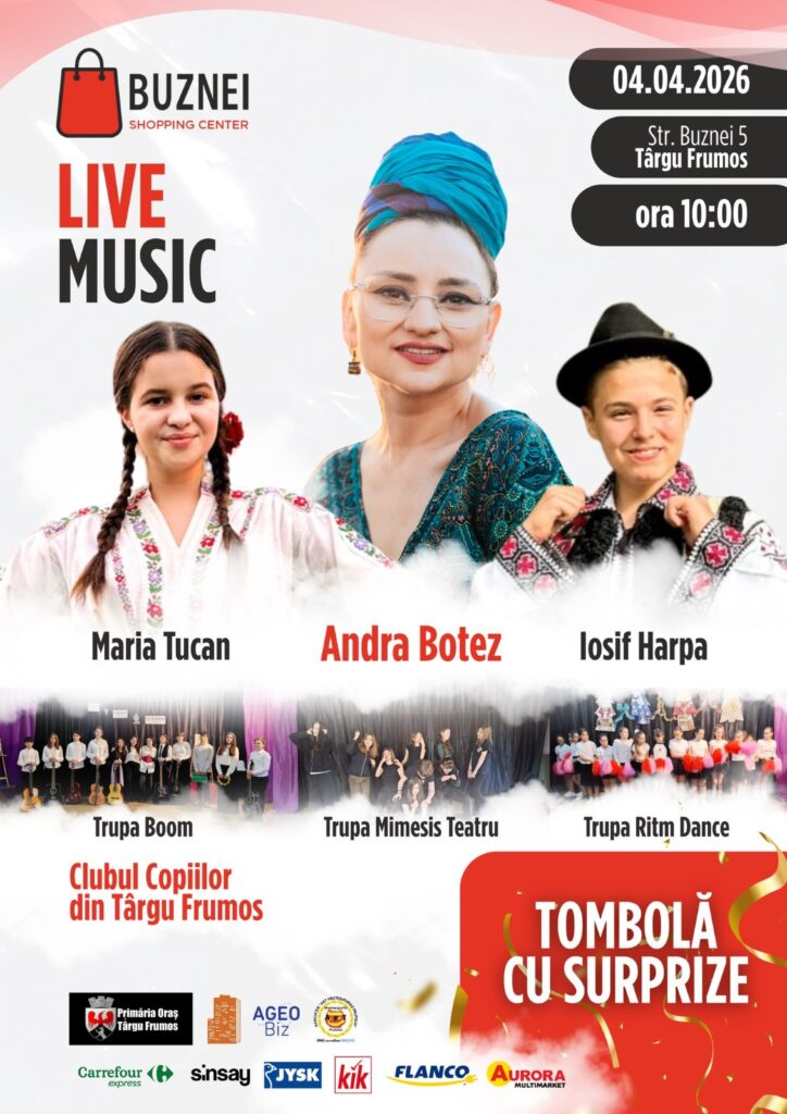 Noul centru comercial Buznei Shopping Center marchează deschiderea oficială a noii locații, printr-un eveniment special dedicat comunității locale, transformând o zi obișnuită de cumpărături într-o experiență plină de bucurie, muzică și surprize pentru întreaga familie. Concertul muzicalva avea loc sâmbătă, 04 aprilie, începând cu ora 10:00, la sediul centrului comercial situat pe Str. Buznei nr. 5, Târgu Frumos, și va aduce împreună artiști consacrați, activități recreative și oferte speciale pentru vizitatori.