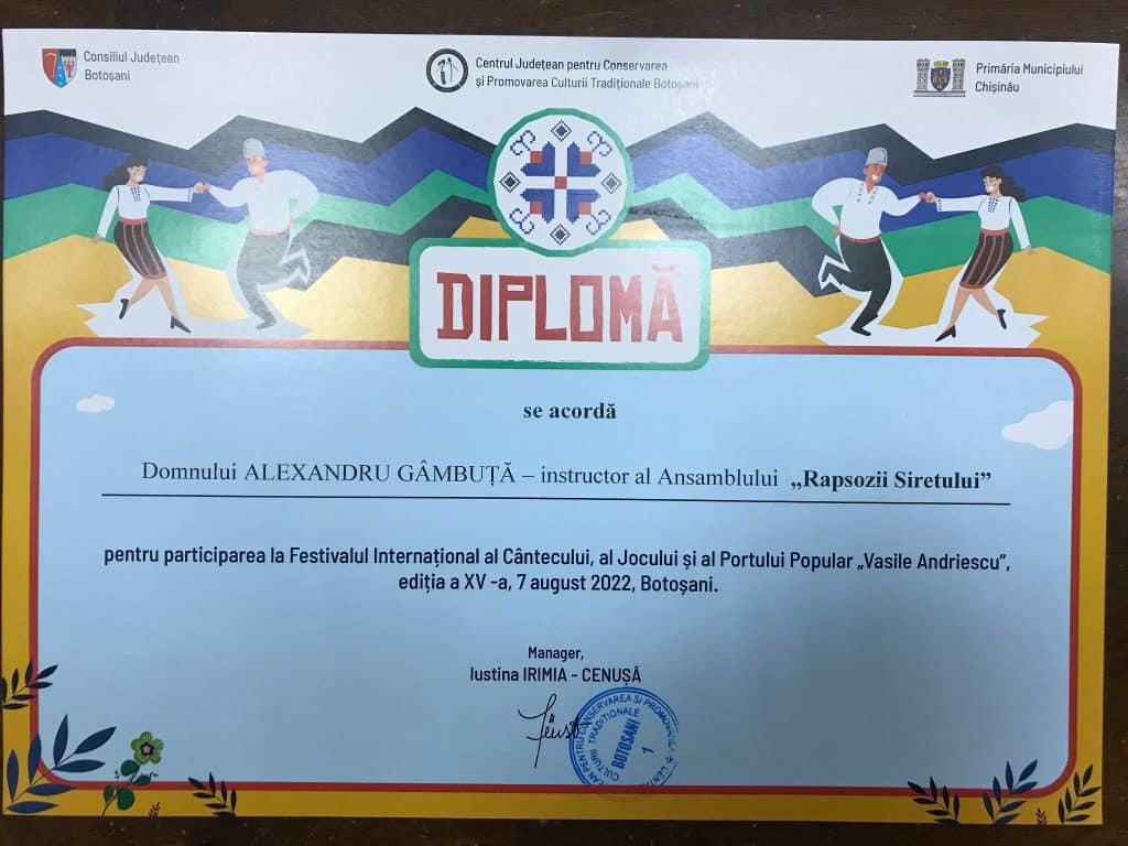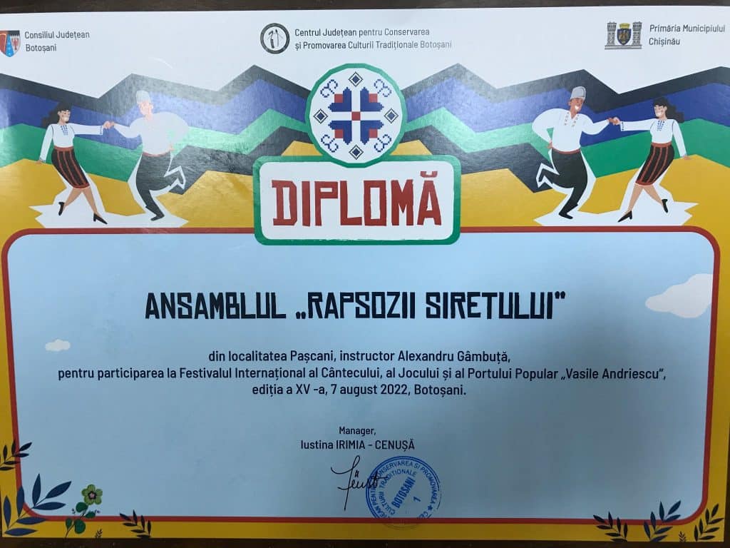 Tinerii talentați au reprezentat municipiul Pașcani, în cadrul acestui eveniment de amploare, și au primit diploma de participare, în semn de recunoaștere a activității deosebite și a efortului depus pentru păstrarea și promovarea tradițiilor locale. Ansamblul ”Rapsozii Siretului” a fost înființat din dorința de a valorifica scenic, tezaurul folcloric din zona noastră.