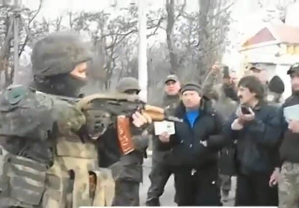 O noua dovada de eroism din partea ucrainenilor. Un grup de oameni se apropie fara frica de cativa soldati rusi chiar daca sunt amenintati cu mitralierele. Chiar daca se trage deasupra capetelor lor, ei incep sa cante imnul Ucrainei.