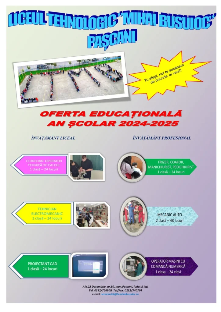 EducațieOferta educațională a Liceului Tehnologic “Mihai Busuioc” Pașcani de RedacțiaJuly 22, 2024July 22, 20240177 Share0 “Din toamnă vă așteptăm să fiți elevii noștri, să parcurgem împreună drumul învățării unei meserii!” Liceul Tehnologic Mihai Busuioc Pascani