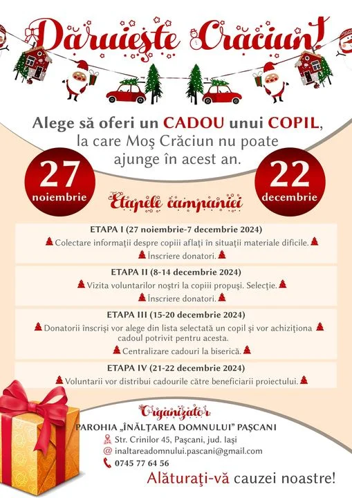 Parohia „Înălțarea Domnului” din Pașcani invită întreaga comunitate să se alăture campaniei dedicate copiilor care provin din familii defavorizate, desfășurată între 27 noiembrie și 22 decembrie 2024. Prin implicarea activă, fiecare dintre noi poate contribui la aducerea unui strop de fericire în viața acestor copii, oferindu-le șansa de a simți bucuria sărbătorilor de Crăciun.