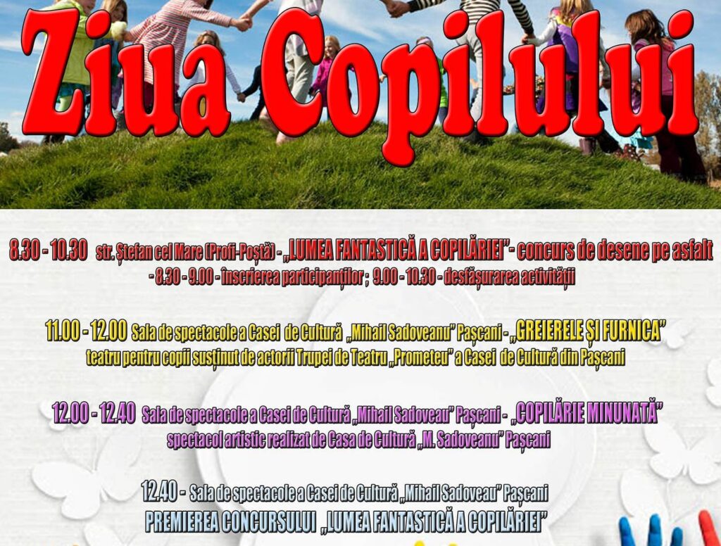 Casa de Cultură „Mihail Sadoveanu” a postat programul activităților ce vor avea loc de 1 Iunie. Astfel, în zona centrală și în incinta instituției de cultură va avea loc un concurs de desene pe asfalt, în cadrul căruia copiii vor primi premii, piesa de teatru „Greierele și furnica”, pusă în scenă de trupa „Prometeu” și un spectacol artistic.
