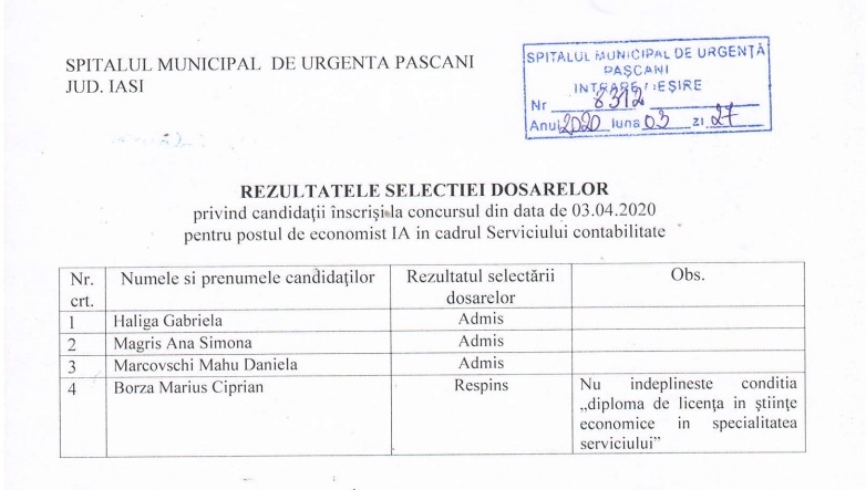 Postul de economist Serviciul de Contabilitate din cadrul Spitalului Municipal Pașcani a fost scos la concurs. Patru persoane și-au depus dosarul, însă unul a fost respins. Concursul are trei etape: selecția dosarelor, proba scrisă și interviu. Proba scrisă va avea loc pe 3 aprilie, iar interviul pe 9 aprilie. Condițiile specifice pentru înscriere au fost diploma de licență în științe economice și 6 ani și 6 luni vechime.