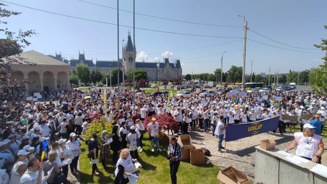 Peste 2.000 de cadre didactice și nedidactice s-au strâns în fața Prefecturii pentru a-și susține revendicările pentru care au declanșat greva generală. Din cauza mulțimii adunate în Centru, circulația pe Anastasie Panu a fost complet închisă.