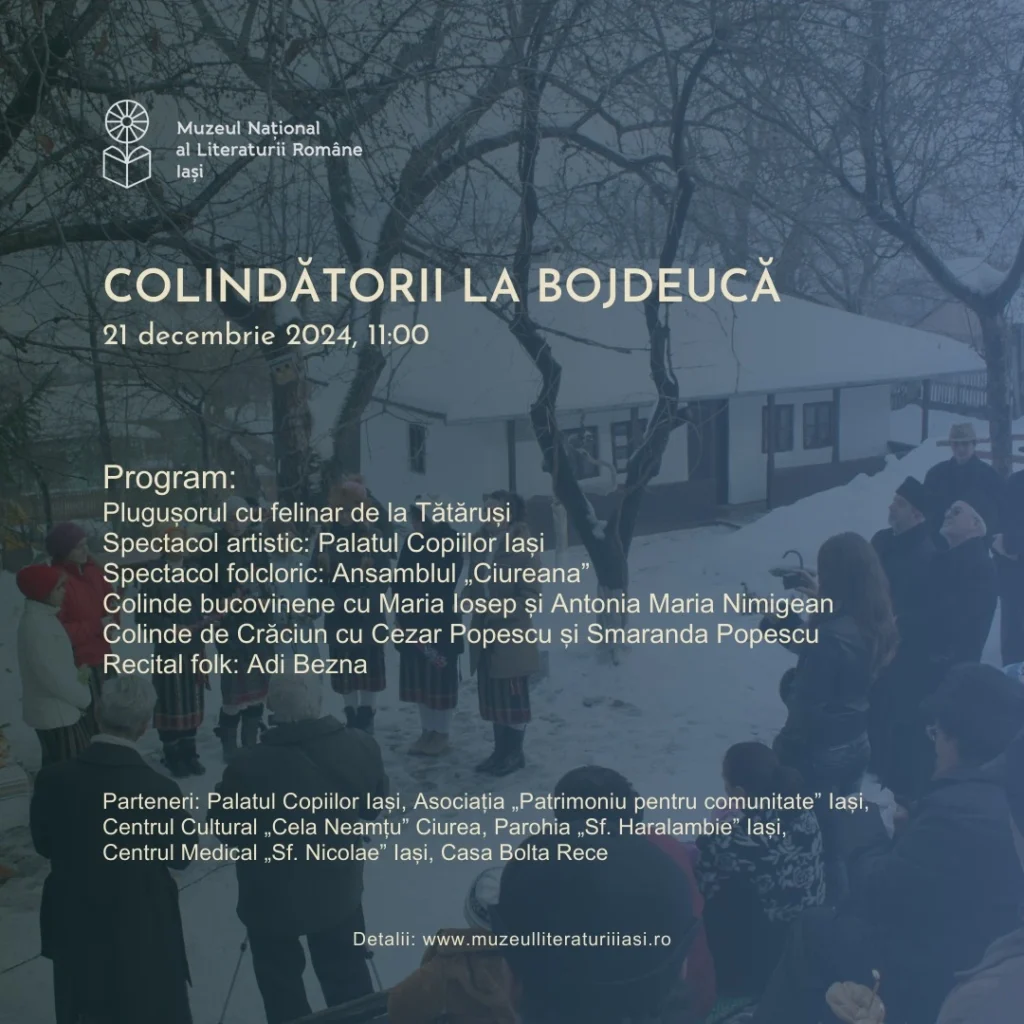 Muzeul Național al Literaturii Române Iași vă așteaptă sâmbătă, 21 decembrie 2024, începând cu ora 11:00, să luați parte la programul special Colindătorii la Bojdeucă. Evenimentul se desfășoară în amfiteatrul Bojdeucii, locul încărcat de istorie, redeschis recent după o amplă reabilitare finanțată prin fonduri europene, accesate de Consiliul Județean Iași în cadrul Programului Operațional Comun România – Republica Moldova 2014-2020.